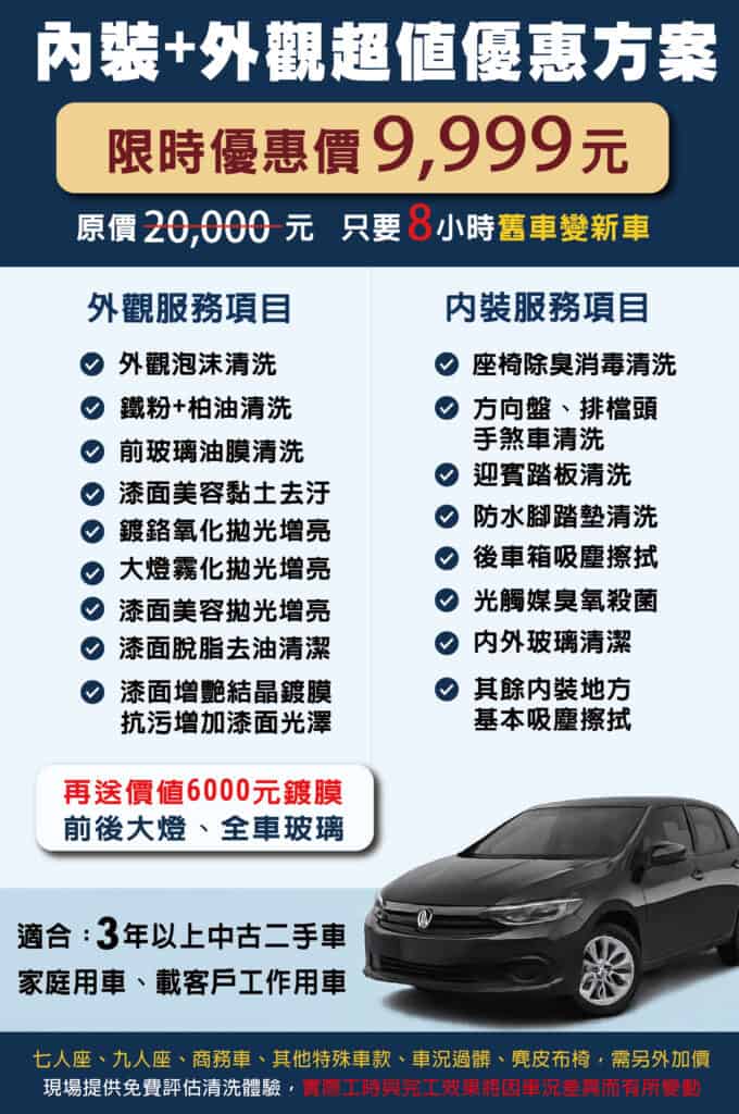 | 派威汽車醫美 | 9,999 元超值方案 | 外觀鍍膜、內裝座椅深度清洗、大燈霧化處理、油膜處理、消臭處理、臭氧殺菌 | 8 小時內交車 | CP 值高,差不多預算,內外全面照顧到,有感升級一天交車。 |